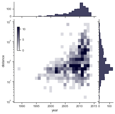 plot_joint(): 두 변수(year, distance) 간의 분포를 히스토그램으로 시각화합니다.