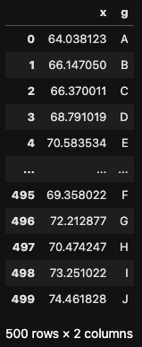 df = pd.DataFrame(dict(x=x, g=g)): x와 g 데이터를 사용하여 데이터프레임을 생성합니다.