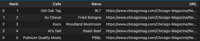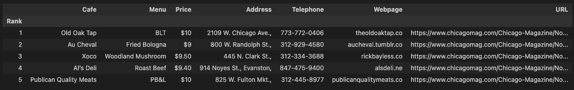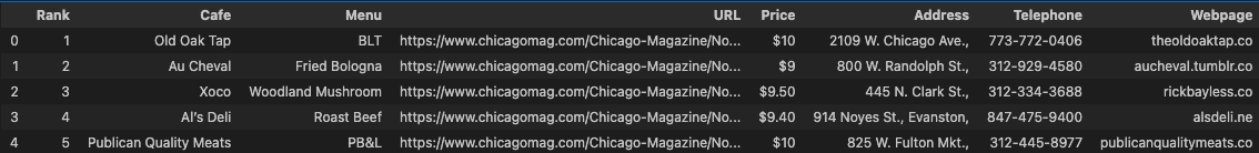 df = df.loc[:, ['Cafe', 'Menu', 'Price', 'Address', 'Telephone', 'Webpage', 'URL']]