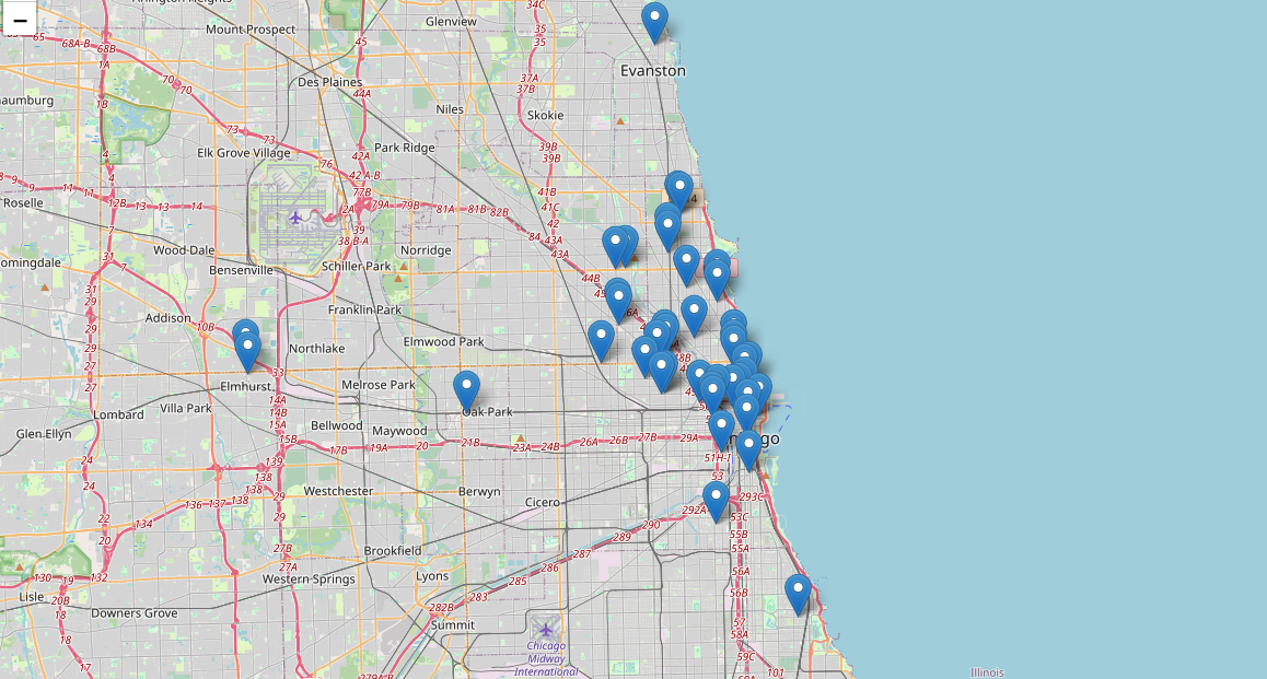 ['2109 W. Chicago Ave.,', '800 W. Randolph St.,', '445 N. Clark St.,', '914 Noyes St., Evanston,', '825 W. Fulton Mkt.,', '100 E. Walton', '1639 S. Wabash Ave.,', '2211 W. North Ave.,', '3619 W. North Ave.,', '3267 S. Halsted St.,', '2537 N. Kedzie Blvd.,', 'Multiple', '3124 N. Broadway,', '3455 N. Southport Ave.,', '2657 N. Kedzie Ave.,', '1120 W. Grand Ave.,', '1141 S. Jefferson St.,', '333 E. Benton Pl.,', '1411 N. Wells St.,', '1747 N. Damen Ave.,', '3209 W. Irving Park', 'Multiple', '5347 N. Clark St.,', '2954 W. Irving Park Rd.,', 'Multiple', '191 Skokie Valley Rd., Highland Park,', 'Multiple', '1818 W. Wilson Ave.,', '2517 W. Division St.,', '218 W. Kinzie', 'Multiple', '1547 N. Wells St.,', '415 N. Milwaukee Ave.,', '1840 N. Damen Ave.,', '1220 W. Webster Ave.,', '5357 N. Ashland Ave.,', '1834 W. Montrose Ave.,', '615 N. State St.,', 'Multiple', '241 N. York Rd., Elmhurst,', '1323 E. 57th St.,', '655 Forest Ave., Lake Forest,', 'Hotel Lincoln, 1816 N. Clark St.,', '100 S. Marion St., Oak Park,', '26 E. Congress Pkwy.,', '2018 W. Chicago Ave.,', '25 E. Delaware Pl.,', '416 N. York St., Elmhurst,', '65 E. Washington St.,', '3351 N. Broadway,']