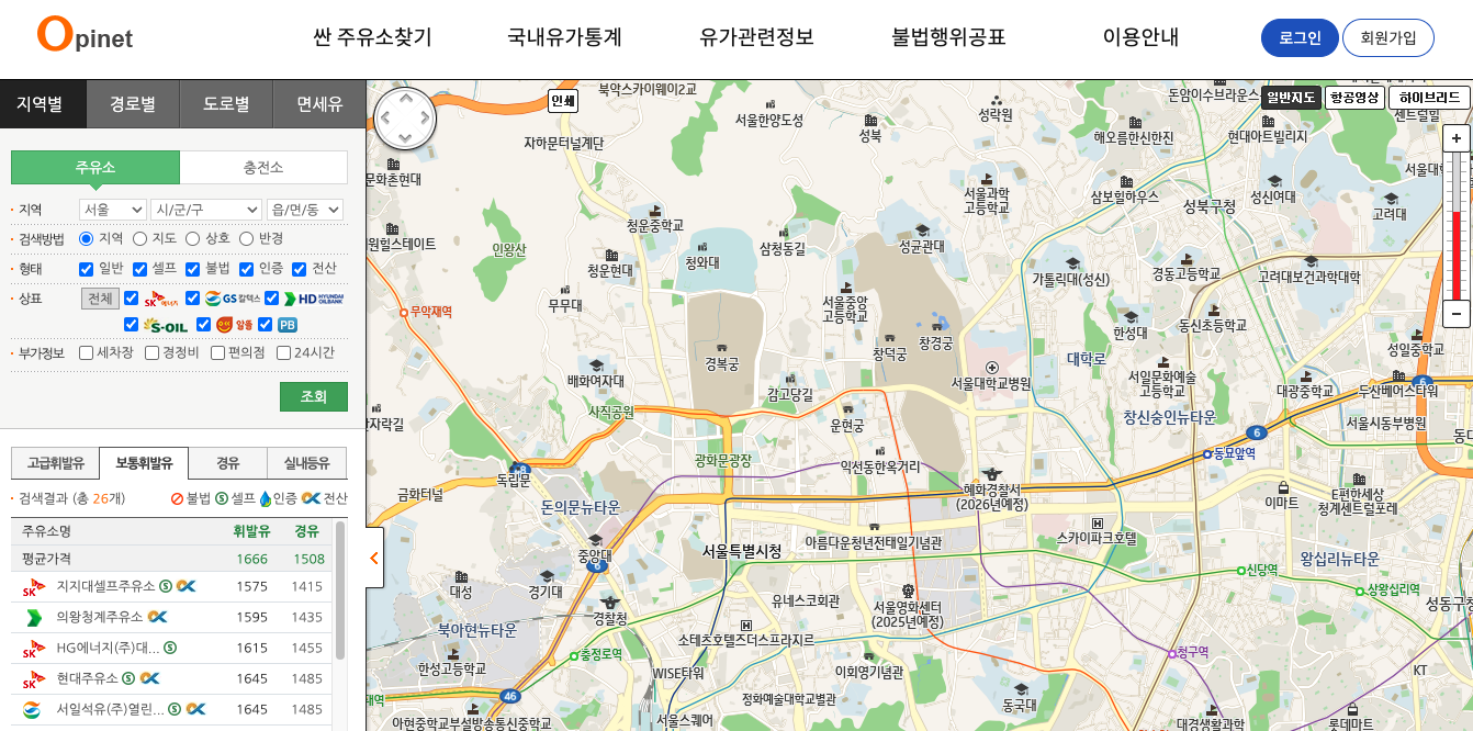 - 싼 주유소찾기 탭: 지역(서울, 경기 etc. -- 금천구, 안양시 etc. ----)