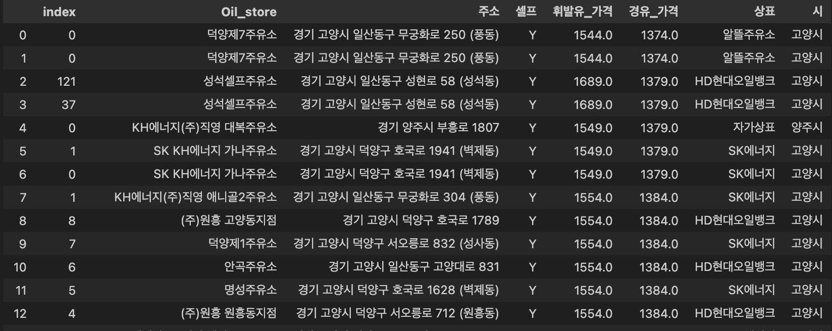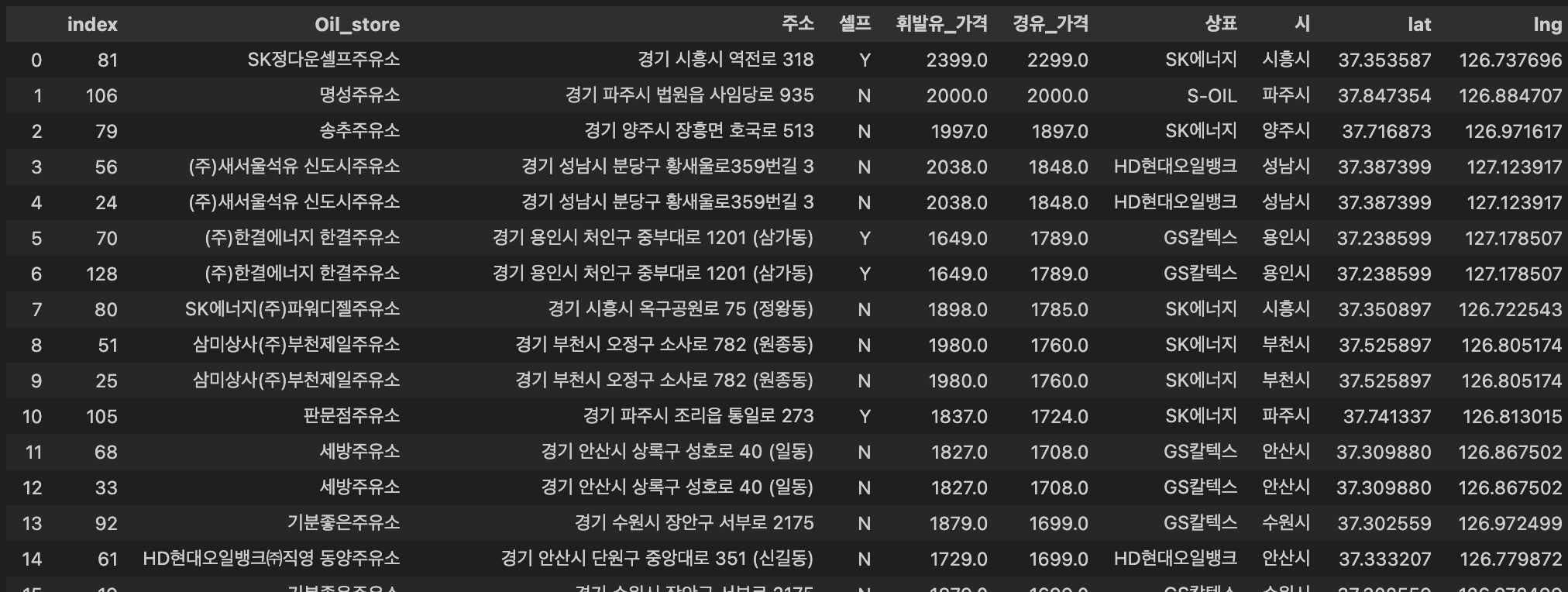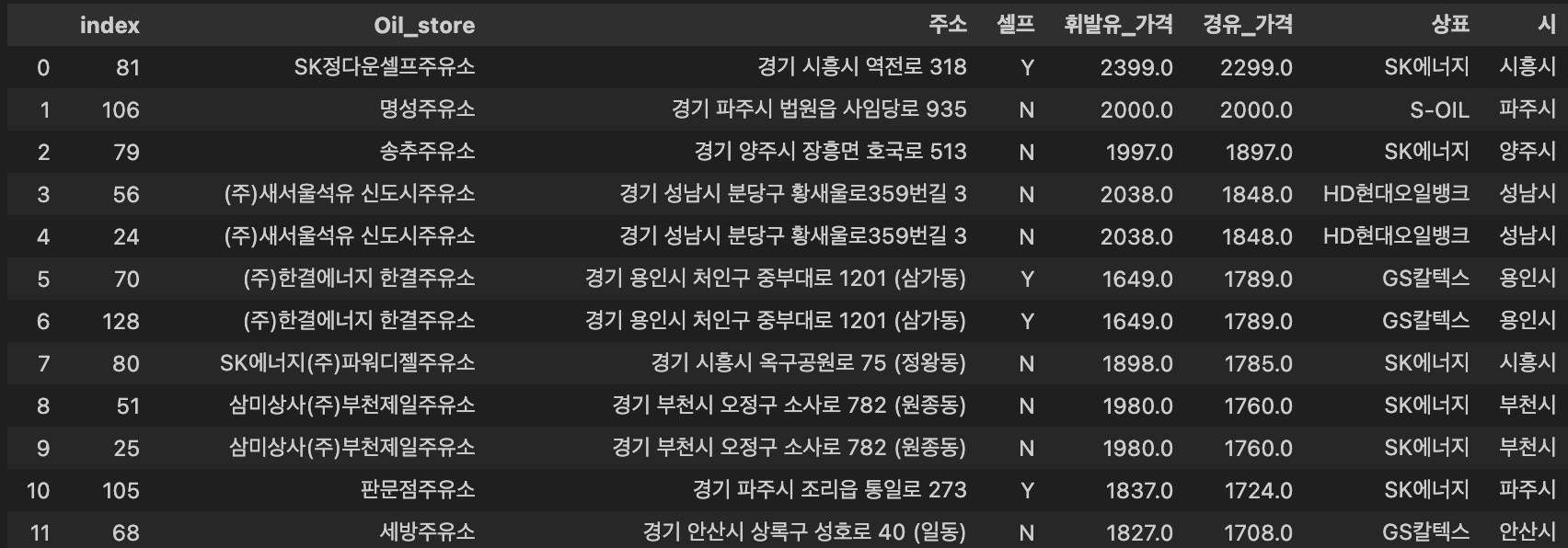 oil_price_bottom10 = stations.sort_values(by = '경유_가격', ascending = True).head(50).reset_index()