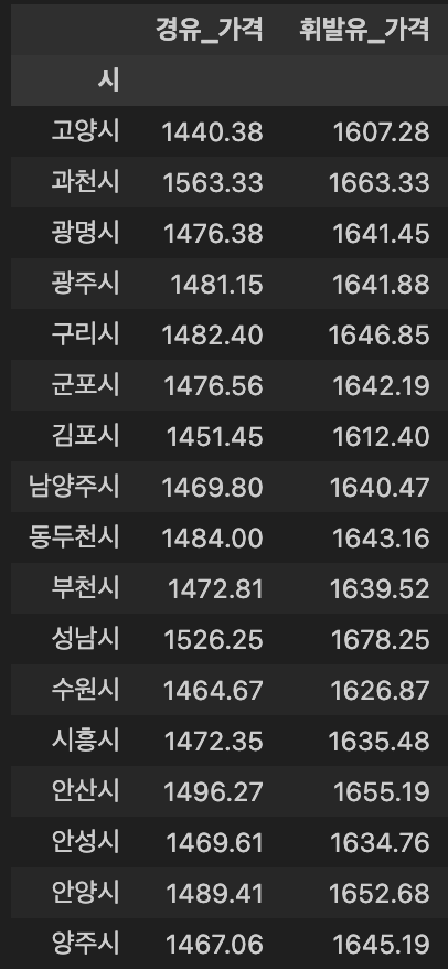 si_data = pd.pivot_table(stations, index = '시', values=['경유_가격', '휘발유_가격'], aggfunc = np.mean).round(2)