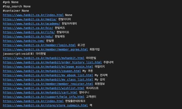 # cssselect() 메서드로 a 요소의 리스트를 추출하고 반복을 돌립니다.