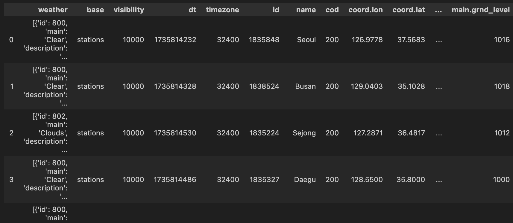 - pd.DataFrame: 지정된 도시들의 날씨 데이터를 포함하는 DataFrame.