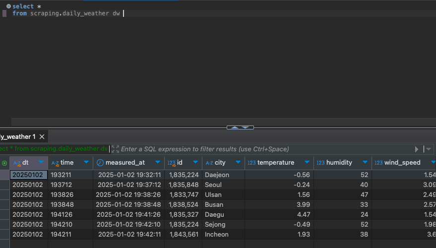 변환된 날씨 데이터를 MySQL 데이터베이스에 로드합니다.