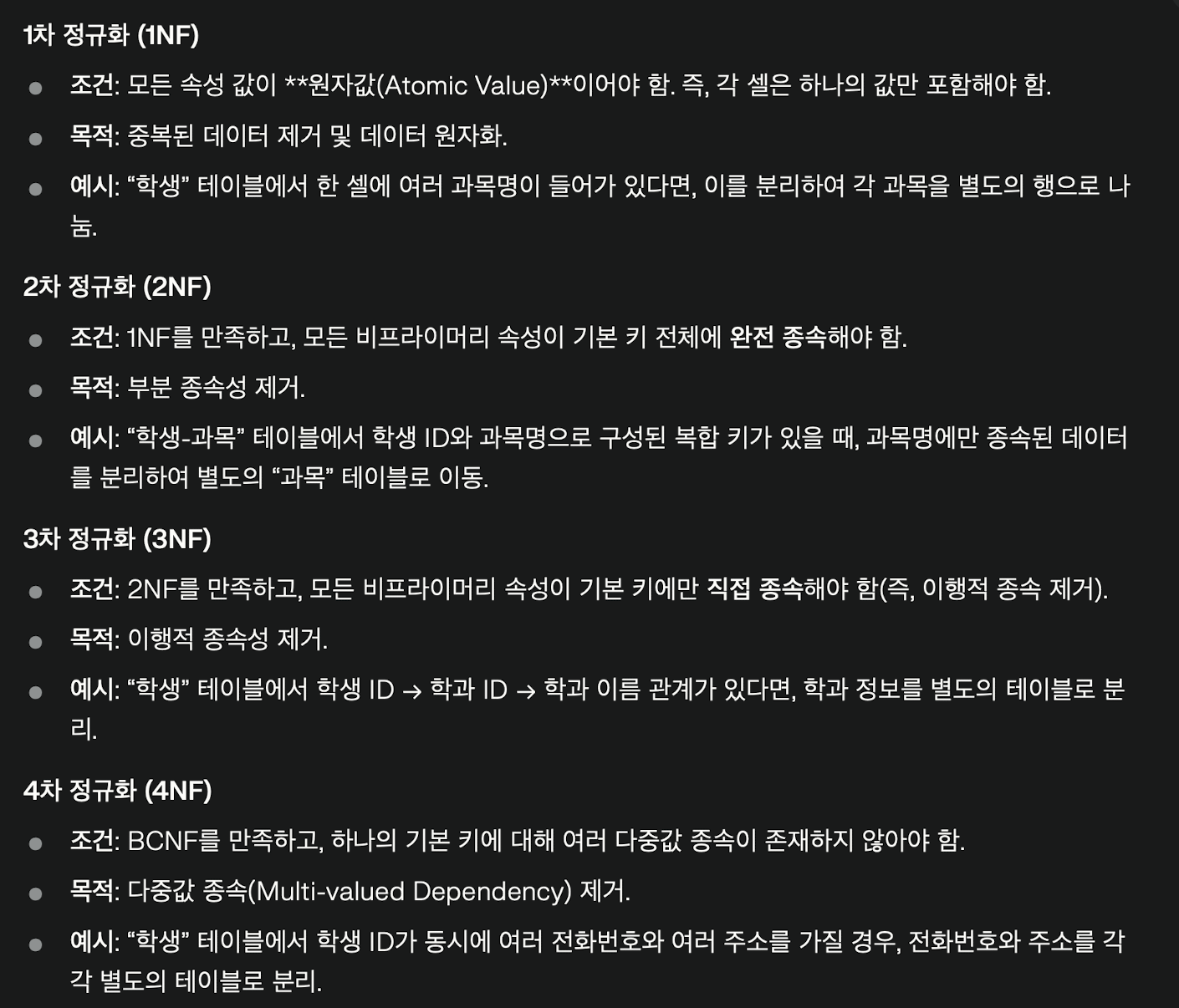 여러 장소에 동일한 데이터를 저장하지 않도록 설계하여 데이터 중복을 줄이고, 데이터 일관성과 효율성을 유지합니다.